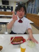 舎生2名と職員2名が机上に残った肉を大急ぎで食べているところ さて、そろそろ終了時間が近づいてきています。